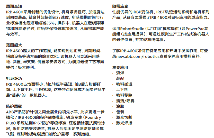 主要用途:IRB 4600是一款非常高效的通用機器人,為縮短節(jié)拍時間進行了優(yōu)化,其纖巧的機身在高密度的工作單元內(nèi)游刃有余。IRB 4600使生產(chǎn)單元布置更緊湊,實現(xiàn)產(chǎn)能與質(zhì)量雙提升,推動生產(chǎn)效率邁上新臺階。