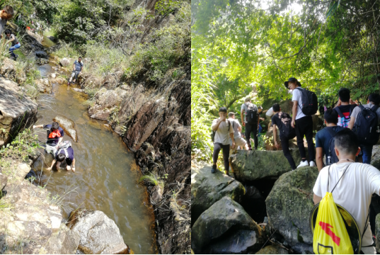 下車后打開行李廂就看到了教練準備的午餐需要的食材,雞鴨魚肉,新鮮蔬菜樣樣俱全,大家都打開了背包自覺扛起了背負食材的重任。流楓一條經典但非常規戶外路線,陡峭的溪谷,遍布四處的河灘,上山要求大家溯溪而上。攀爬了將近3小時,你早已分不清哪些是汗水哪些是溪水,一路上大家四肢并用,食材、鍋具相互傳遞,鞋子早已經濕了無數次。中途有三三兩兩的小伙伴累趴了,停下休息。大家相互協作,相互扶持所幸全員登頂。陽光總在風雨后,登頂后站在高處,仰望藍天白云,遠山如黛,風吹過帶來絲絲涼意,令人更覺溯溪的難能可貴