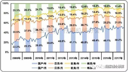 外資品牌市場占有率前3依次為卡特彼勒、斗山和小松。