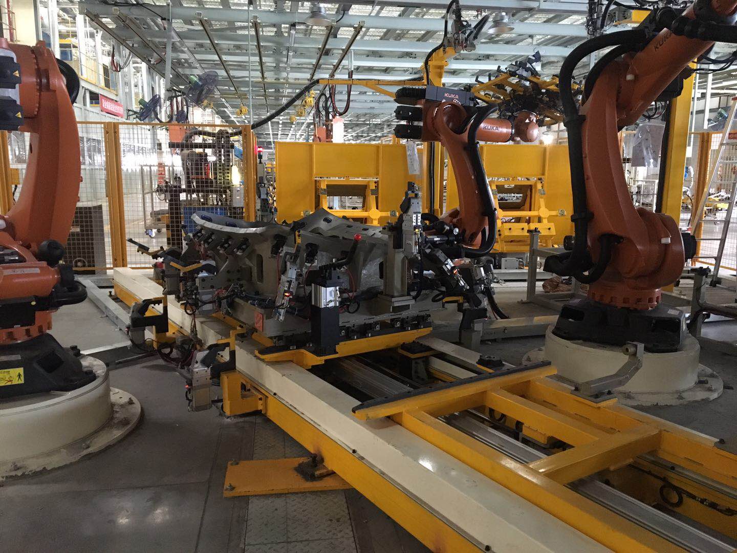 功能與用途:E315門蓋自動生產(chǎn)線同時運用機器人滾邊、換模機構(gòu)、機器人視覺檢測及自動涂膠等工藝方法將各種零部件拼裝在一起的自動化生產(chǎn)線,主要由自動化輸送設(shè)備、焊裝夾具、焊接機器人及滾邊機器人、滾邊設(shè)備等其他輔助設(shè)備等組成。工件由自動化輸送設(shè)備傳輸,由焊裝夾具/滾邊夾具迅速準確定位,由焊接機器人完成焊接作業(yè)、滾邊機器人完成滾邊作業(yè)。可實現(xiàn)4種車型的柔性切換,滿足汽車白車身完整覆蓋件的焊接包邊工藝。可實現(xiàn)生產(chǎn)節(jié)拍30JPH,自動化率高達90%以上。以下是我公司為江鈴集團做的E315門蓋自動生產(chǎn)線的圖片