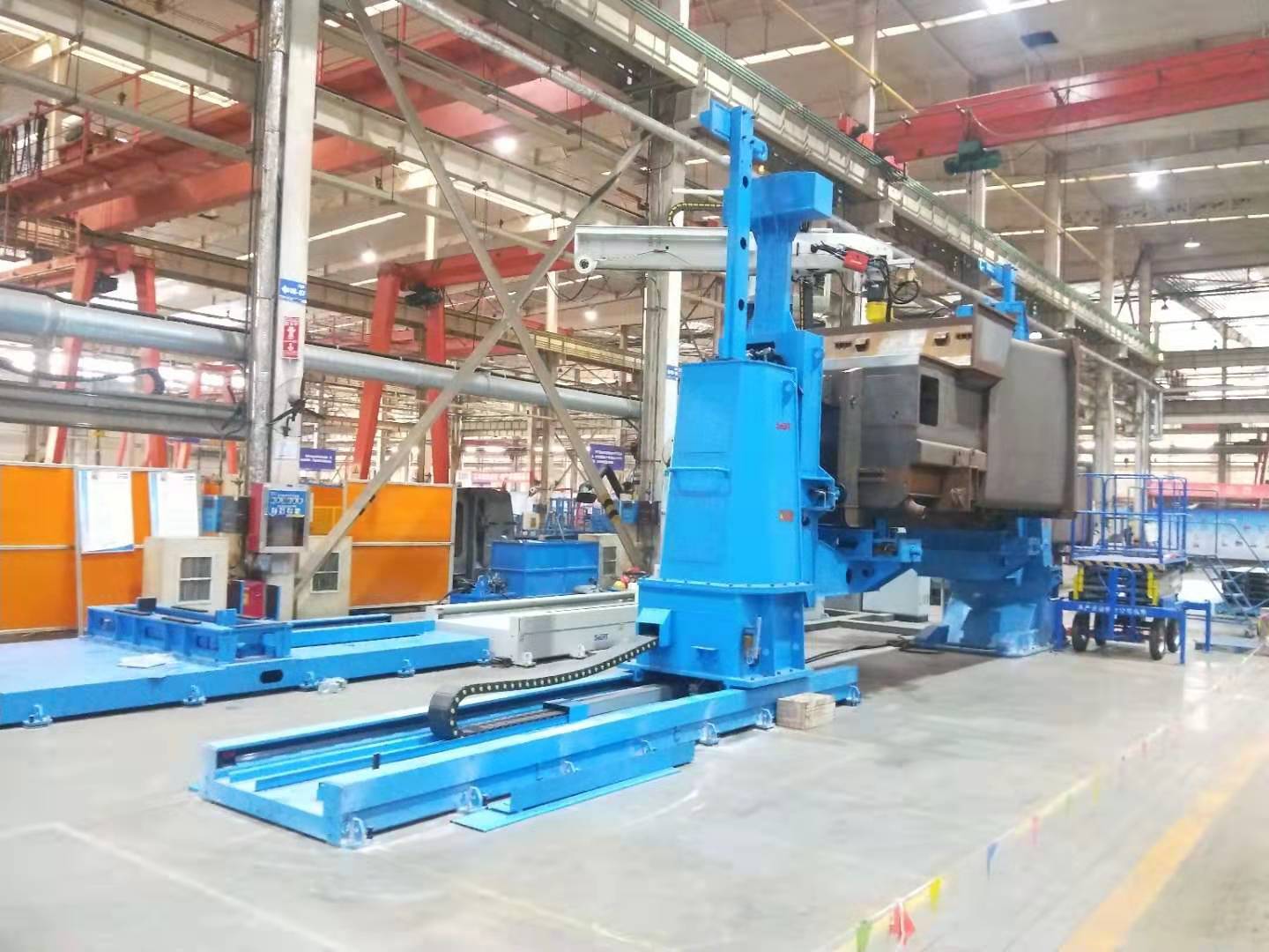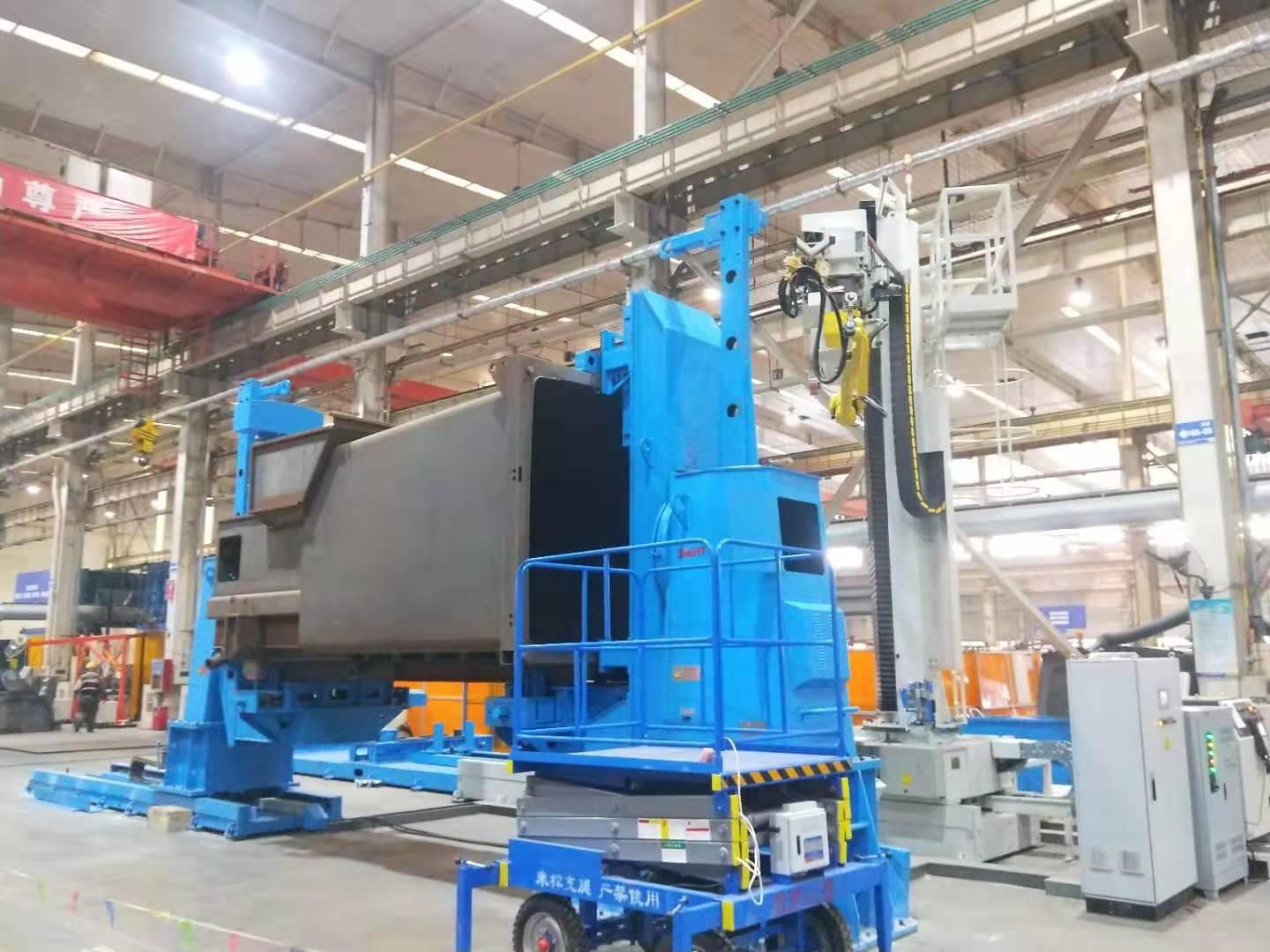 本機器人焊接系統采用單工位作業方式,由日本FANUC MI0iA- 8L -2028機器人、 懸臂式操作機、Artsen PM 500F焊接系統組合而成,用于移動站箱體的焊接,總軸數11軸可以聯動,其中包括相匹配的翻轉機一個外部軸。