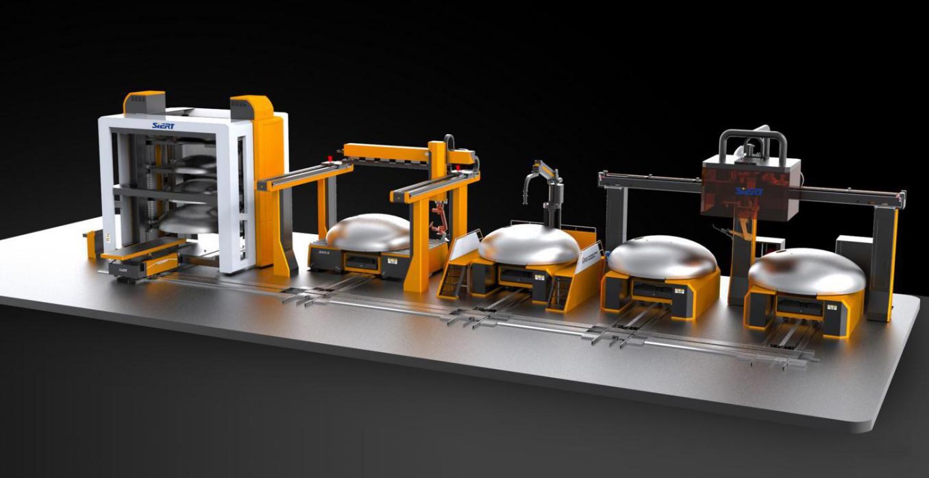 ? ? ? 封頭是壓力容器的端蓋,是容器設(shè)備關(guān)鍵的承壓部件之一。在石油、化工、食品和制藥等諸多行業(yè)的容器設(shè)備上都是不可欠缺的一部分,封頭品質(zhì)的優(yōu)劣直接關(guān)系到壓力容器使用的安全性。 目前無論是沖壓成型還是旋壓成型的封頭都要經(jīng)過封頭齊邊加工過程,以獲得準(zhǔn)確的垂直于封頭幾何中心軸線的封頭底邊。保證后續(xù)與筒體對(duì)接焊縫的焊接質(zhì)量,保證壓力容器成品合格率。方案為車間級(jí)MES制造執(zhí)行系統(tǒng),含1條全自動(dòng)生產(chǎn)線,1臺(tái)可自由穿梭的RGV物流小車,含1個(gè)立體料庫、1個(gè)機(jī)器人切割工作站、1個(gè)人工組對(duì)工位、2個(gè)機(jī)器人焊接工作站。